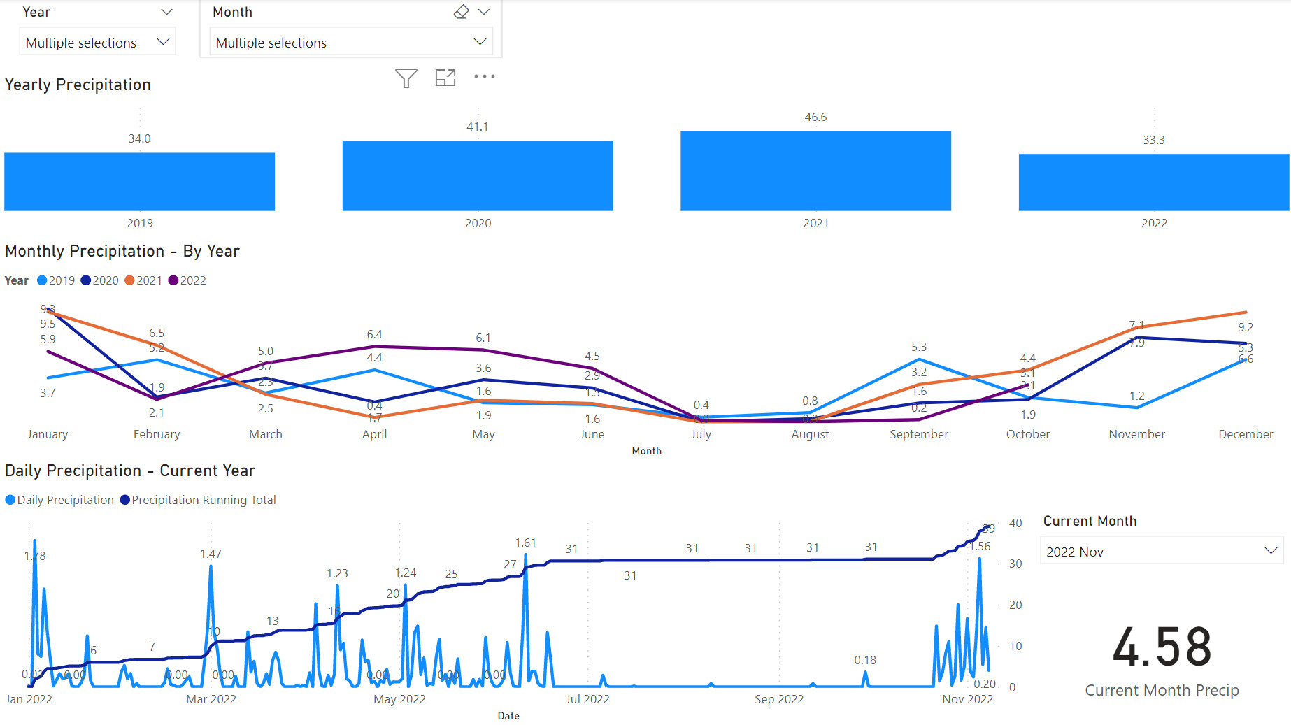 These visualizations are helpful to quickly see how the current year, month, and daily rain compare to historical trends.