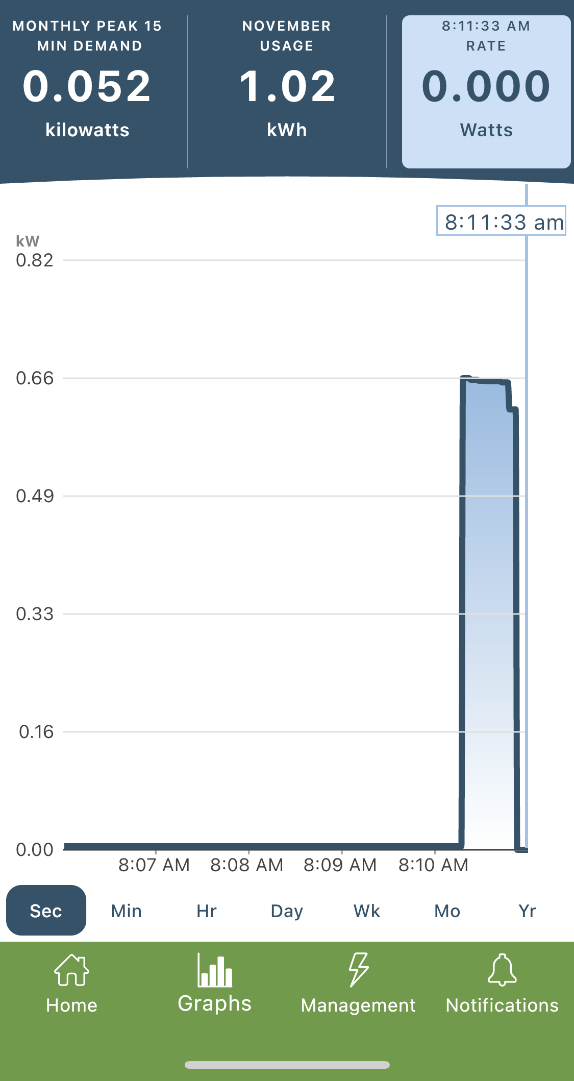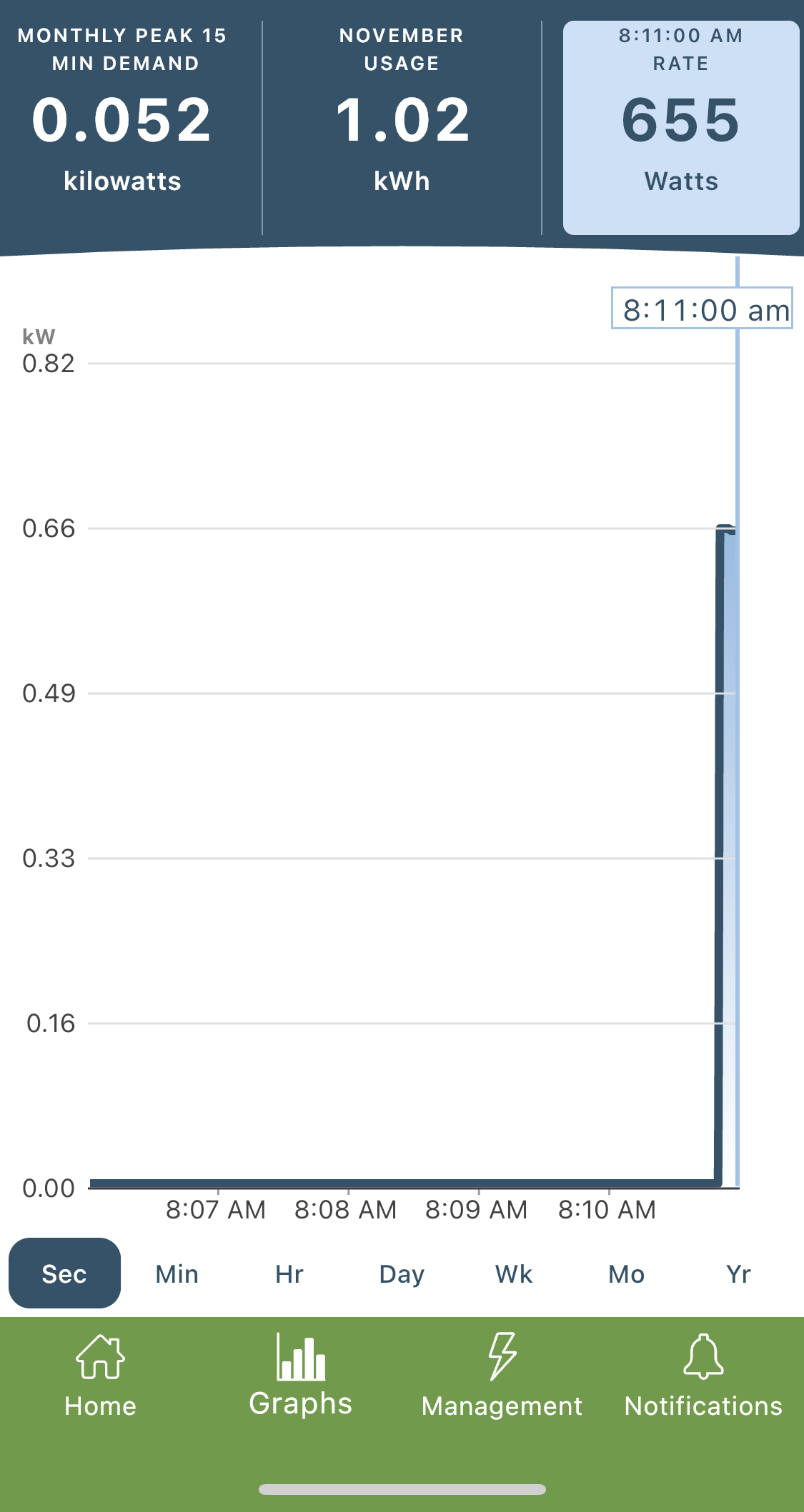 In addition to providing daily kilowatt-hours (kWh) consumed, my smart plug also provides kilowatts on a per-second basis.